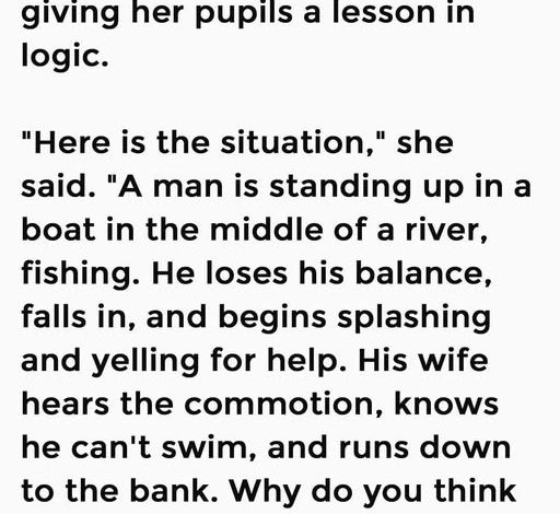 “Here is the situation,” she said. “A man is standing up in a boat in the middle of a river, fishing. He loses his balance, falls in, and begins splashing and yelling for help. His wife hears the commotion, knows he can’t swim, and runs down to the bank. Why do you think she ran to the bank?”
