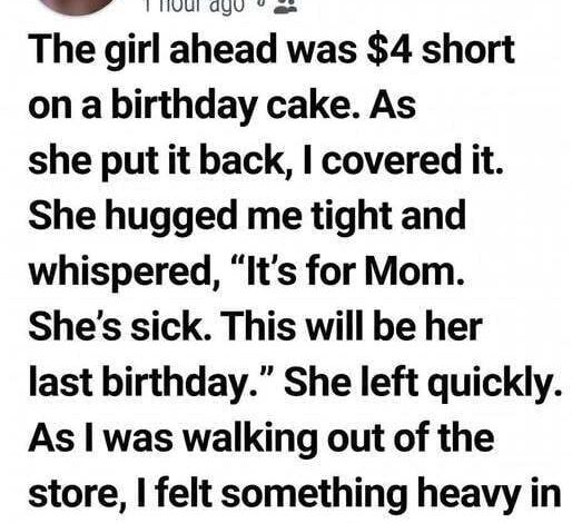 Her reaction wasn’t just relief; it was a profound, soul-deep shock. She looked up at me, her eyes wide, and then she did something I didn’t expect—she reached out and gave me a gentle, lingering hug. She whispered that the cake was for her mother, who was very sick at home. In that moment, the entire atmosphere of the grocery store shifted. The cake wasn’t just a sugary confection; it was a desperate, beautiful attempt to bring a sliver of joy into a household shadowed by illness. It was a fragile bridge of hope, and she had almost been forced to watch it collapse at the register.