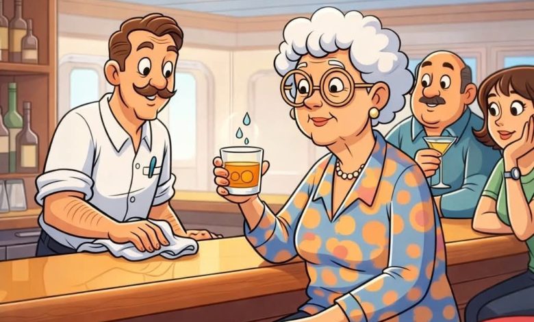 An elderly woman walked into the bar on a cruise ship and politely ordered a Scotch with just two drops of water.