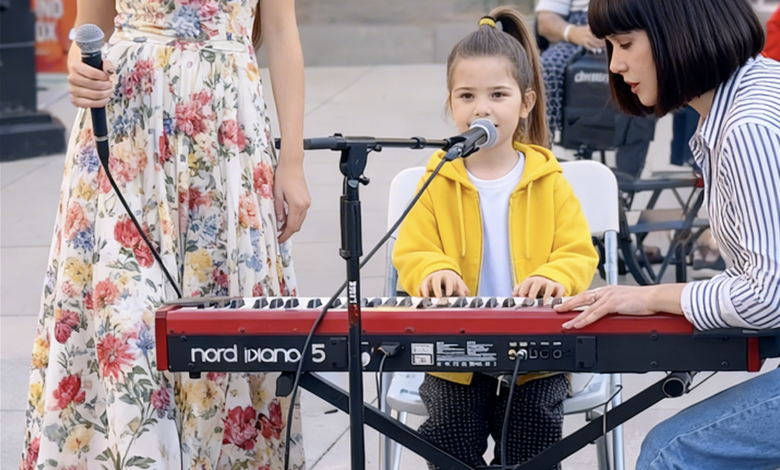 What began as a typical street performance setup quickly transformed into something far more meaningful than anyone expected. Surrounded by the everyday movement of a busy shopping area, a small child sat behind a keyboard, preparing to sing.