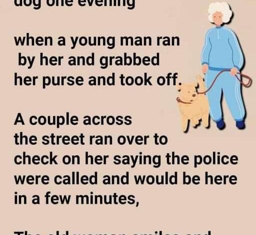 One evening, an old woman was walking her dog when a young man ran by her, grabbed her purse, and took off.