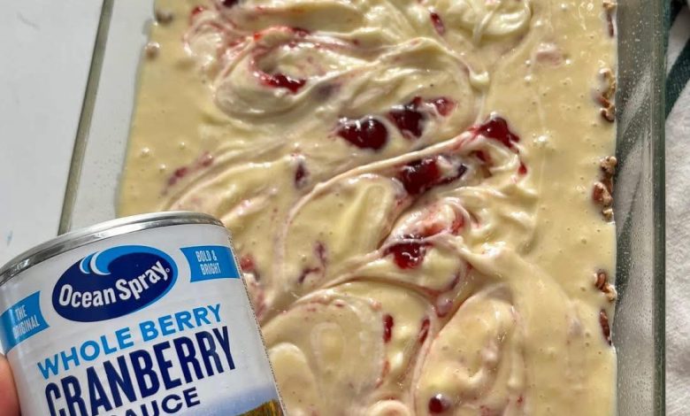 This festive, easy-to-make sheet cake starts with a boxed mix and incorporates pecans on the bottom, with a creamy, sweet cream cheese mixture and whole cranberry sauce swirled throughout.