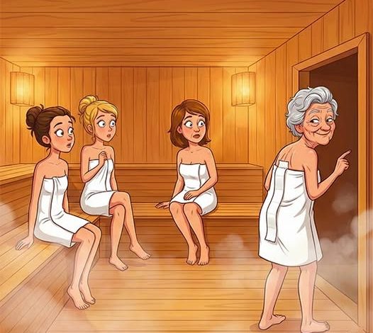 Four women were relaxing together in a warm sauna, each wrapped comfortably in a towel, enjoying a peaceful break from their busy routines. The atmosphere was calm and quiet, the kind of stillness that makes even the smallest sound noticeable. Two of the women were young, one was middle-aged, and the fourth was a lively senior whose sharp eyes hinted she always had a witty remark ready.