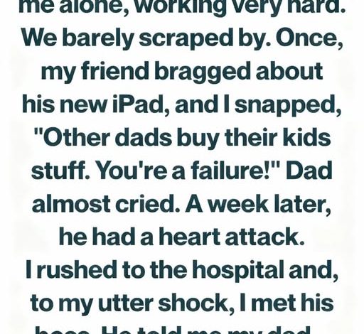 A week later, everything changed. My dad suffered a heart attack, and I rushed to the hospital terrified, replaying my cruel words over and over in my head. While waiting in the hallway, a man approached me and introduced himself as my father’s boss. He didn’t know who I was at first, but when he realized I was his son, his expression softened. He told me things about my dad that I had never known—how he was the first to arrive and the last to leave, how he often took extra shifts no one else wanted, and how he had turned down better-paying opportunities because they required moving farther away or working hours that would leave me alone too much. Listening to him felt like having a veil lifted from my eyes.