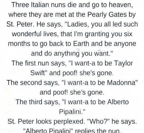 At the Pearly Gates, beneath clouds arranged as neatly as a gallery display, three Italian nuns arrived together after long lives devoted to service, prayer, and quiet devotion. They stood side by side, hands folded, habits perfectly pressed, faces calm and curious. St. Peter greeted them warmly, smiling as he checked their names off a brilliantly glowing list.