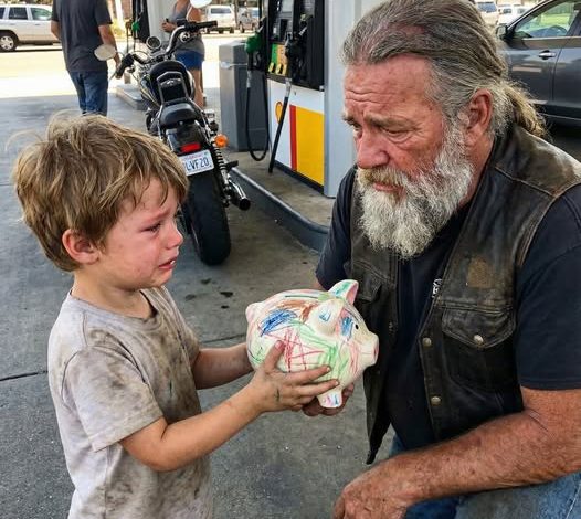 The little boy offered his piggy bank to the biker at the gas station and said six words that made my blood run cold: “Please make my daddy stop hurting mommy.” He was maybe five years old, holding a ceramic pig covered in crayon marks, tears streaming down his face. I’d just finished filling up my Harley when I felt small fingers tugging on my vest.