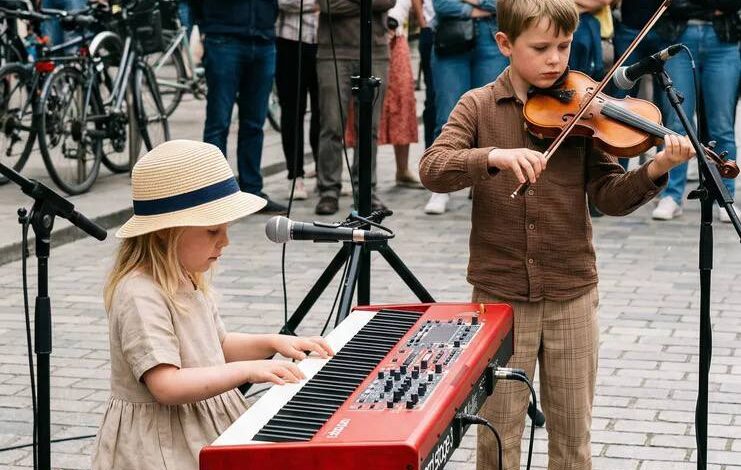In the middle of a busy street, a small setup caught the attention of passersby. A young girl, no older than four, sat behind a keyboard, while her slightly older brother stood beside her holding a violin. At first glance, it looked like a simple, almost playful moment.