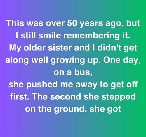 This was over 50 years ago, but I still smile remembering it. My older sister and I didn’t get along well growing up. One day, on a bus, she pushed me away to get off first. The second she stepped on the ground, she got her skirt caught in the door and the driver, not noticing, started to pull away.