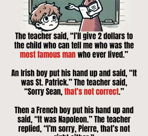 In a lively classroom, a teacher once tried to spark engagement by offering a small reward. She announced that she would give two dollars to the student who could name the most famous man who ever lived. An Irish boy confidently raised his hand and declared it was Saint Patrick. The teacher smiled politely but told him the answer was incorrect. A French boy followed, proudly naming Napoleon, only to receive the same response.