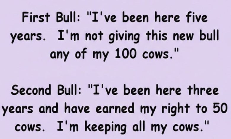 The second bull, a bit younger but still confident, adds, “I’ve been here three years and earned my right to 50 cows. I’m keeping all my cows.”