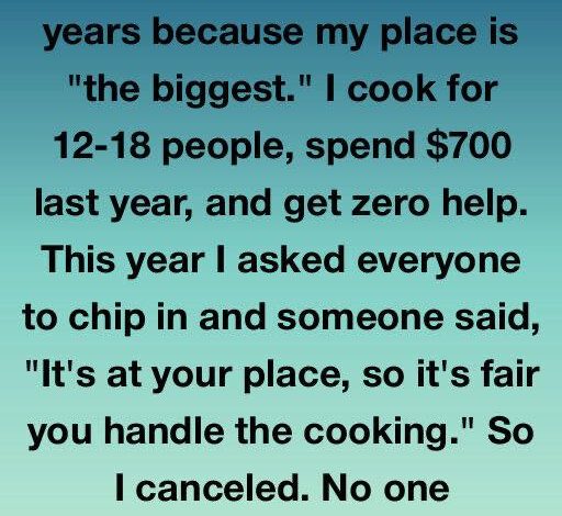 The moment something finally cracked wasn’t dramatic, but it was sharp enough to leave a lasting mark. Last Christmas, as I rushed between the oven and the counter, my cousin Silas lounged on the couch and commented that the stuffing wasn’t “moist enough,” delivering his critique without malice but also without awareness. Not a single person offered to help clear plates, wash dishes, or even refill a glass of water. By midnight, after everyone had left, I stood alone in the kitchen scrubbing a roasting pan that felt welded to my hands, staring at my reflection in the darkened window. I barely recognized myself. In that moment, the realization hit with uncomfortable clarity: I was no longer a host. I was an unpaid caterer who happened to own the building. That awareness lingered into the new year, growing stronger each time someone casually assumed I’d handle the next gathering. When the holidays rolled around again, I decided to try something different. I didn’t make demands or issue ultimatums. I simply asked, politely and clearly, that everyone chip in this year—either financially, through cooking, or by sharing the workload. The response came quickly and stung more than I expected: “It’s at your place, so it’s fair you handle the cooking.” That single sentence erased years of effort in one stroke. So I canceled. I said I wouldn’t host if the burden remained entirely mine. No one volunteered to take over. Instead, they organized a “Plan B” Christmas without me, and somehow, that hurt more than the money ever did.